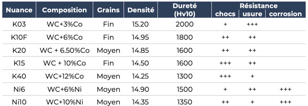 - Tungstène (WC) : dureté extrême, comparable à celle du diamant